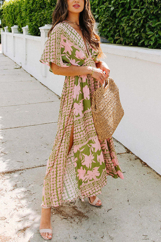 High Waist Spice Girl Dolman Sleeve V Neck Print Sexy Women's Dress