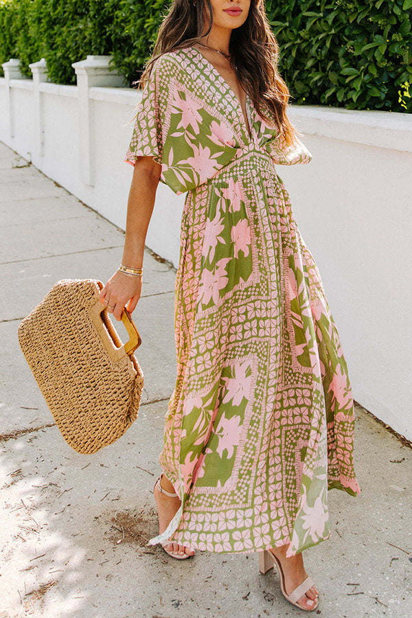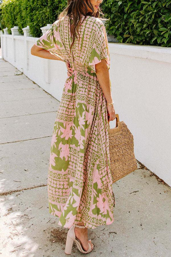 High Waist Spice Girl Dolman Sleeve V Neck Print Sexy Women's Dress